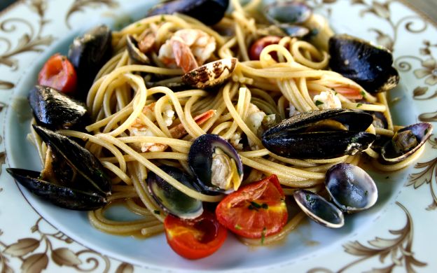 • Homemade pasta with tomato and basil