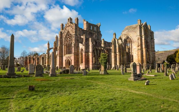 Travel to Melrose and explore its great Border Abbey, founded by the Cistercians in the 12th century. The abbey is the burial place of Robert the Bruce's heart, brought back from the crusades in Moorish Spain.