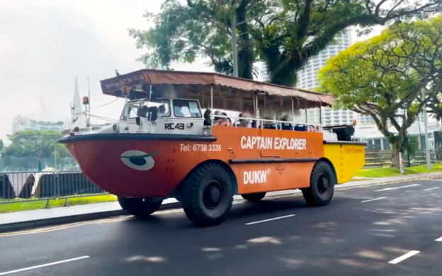 Board a revamped World War II DUKw amphibious vehicle for a thrilling land and sea trip around dynamic Singapore.