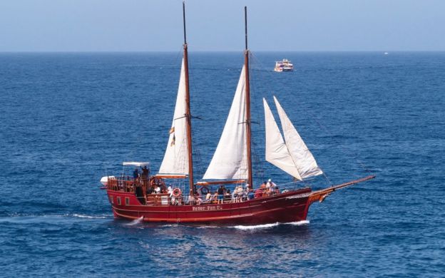 Enjoy the most enjoyable and fun family cruise aboard an authentic Portuguese Goleta of the last century that will revive the emotions of ancient sailing, as well as stories of pirates that once surfed these seas. The boat has 2 decks, 2 services, an open bar and a large central table. Languages available are Spanish, English, French, German and Italian and it is a guided tour.